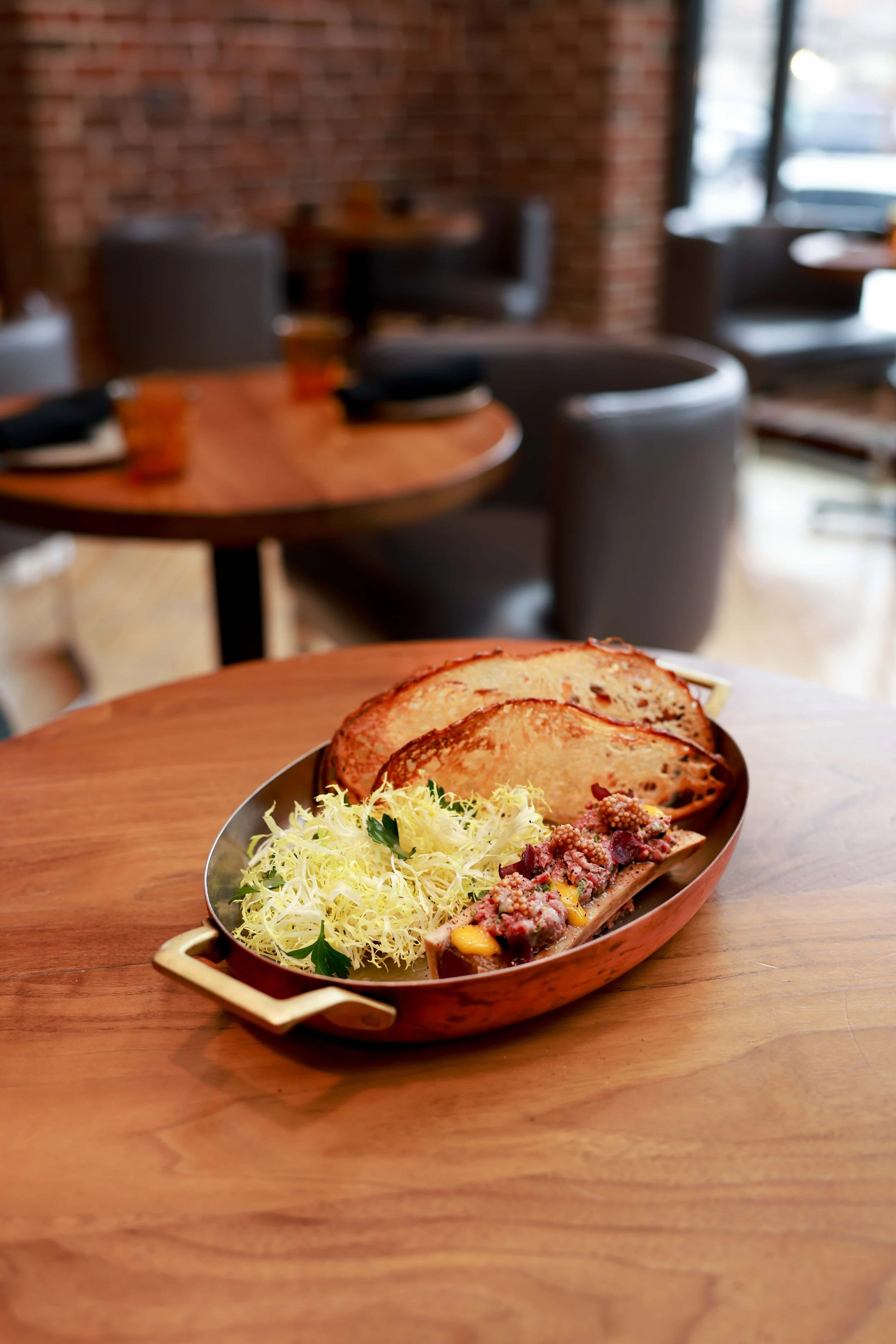 Precision is essential—knife-cut beef, restrained seasoning, and temperature contrast between warm marrow and chilled tartare define the dish. The porcini vinaigrette should cut through the richness while amplifying the umami depth.